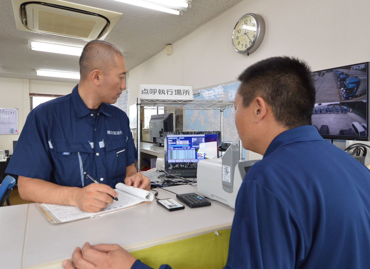 弊社では、安全と品質の向上に役立つ設備投資も積極的に行っております。デジタコ一体型のドライブレコーダーをはじめ、携帯型アルコール検知器も全車に導入。全ドライバーにタブレット端末を活用した点呼。ドライバーへの指示・伝達事項の連絡、体調確認、酒気帯びのチェックなどに使用しております。タブレット端末は点呼を厳格に実施するために導入致しました。 点呼時に動画でドライバーの状態を確認し、その場でアルコールチェック。また、事故が起きたとき、その現場をドライバーに撮影・送信してもらうことで状況を正確に把握し、 適切な対応が可能になりました。そのためお客様にも、正確に状況が説明可能ですので大変好評です。さらに書面でやりとりが多い指示・伝達の迅速化、ペーパーレス化を実現しております。